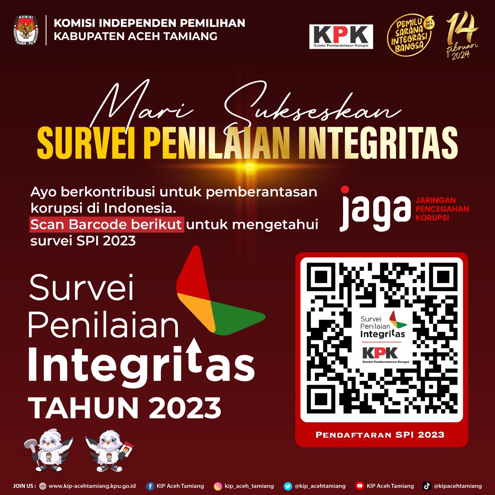 Sesuai Surat Edaran Ketua KPU Nomor 9 Tahun 2023 tentang Pelaksanaan Survei Penilaian Integritas Tahun 2023 di lingkungan Komisi Pemilihan Umum. Komisi Independen Pemilihan Kabupaten Aceh Tamiang mengajak seluruh lapisan masyarakat untuk membantu kami untuk mingkatkan kulaitas pelayanan dengan cara menjadi responden dalam melakukan Survei Penilaian Itegritas.