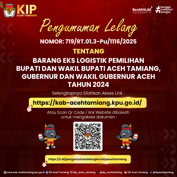 Pengumuman Lelang Barang Milik Negara (BMN) Berupa Barang Eks Logistik Pemilihan Bupati dan Wakil Bupati Aceh Tamiang, Gubernur dan Wakil Gubernur Aceh Tahun 2024 Komisi Independen Pemilihan (KIP) Kabupaten Aceh Tamiang. Tautan Pengumuman ....
