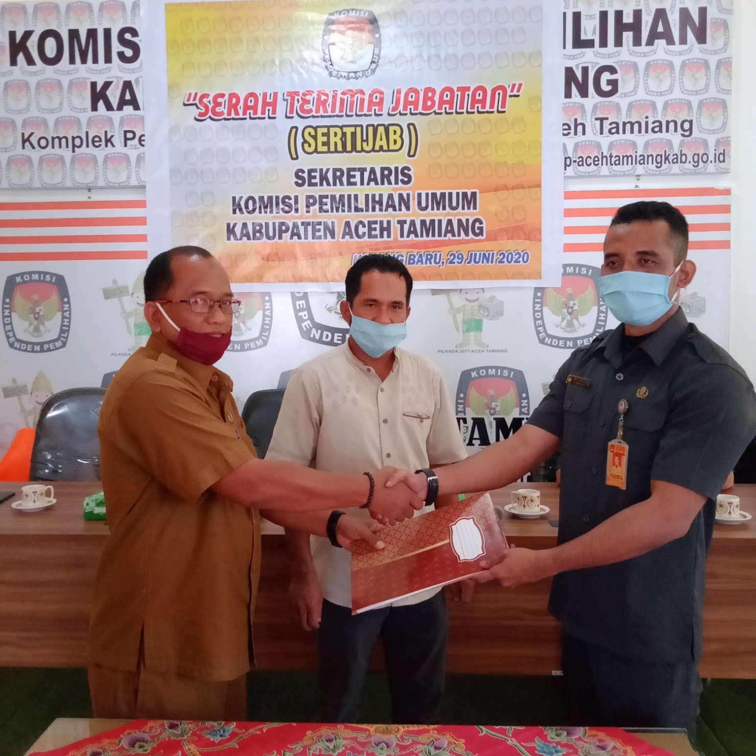 Karang Baru, kab-acehtamiang.kpu.go.id-Komisi Independen Pemilihan (KIP) Kabupaten Aceh Tamiang melakukan serah terima jabatan (sertijab) antara Sekretaris KIP Aceh Tamiang yang lama, Aditia Purnama, kepada Plt. Sekretaris KIP Kabupaten Aceh Tamiang Diecky Fachriessa, SH. Sertijab dilaksanakan di Aula KIP Kabupaten Aceh Tamiang pada senin, (29/6/2020).