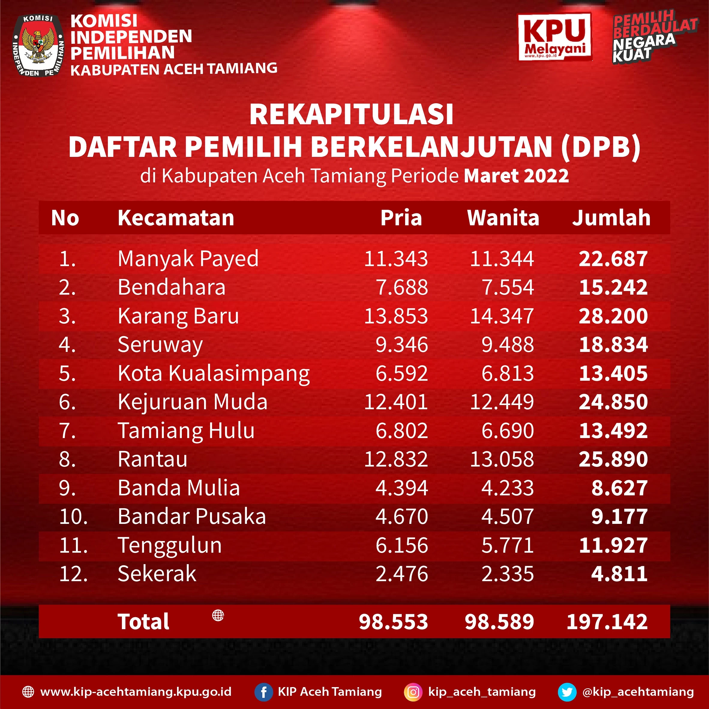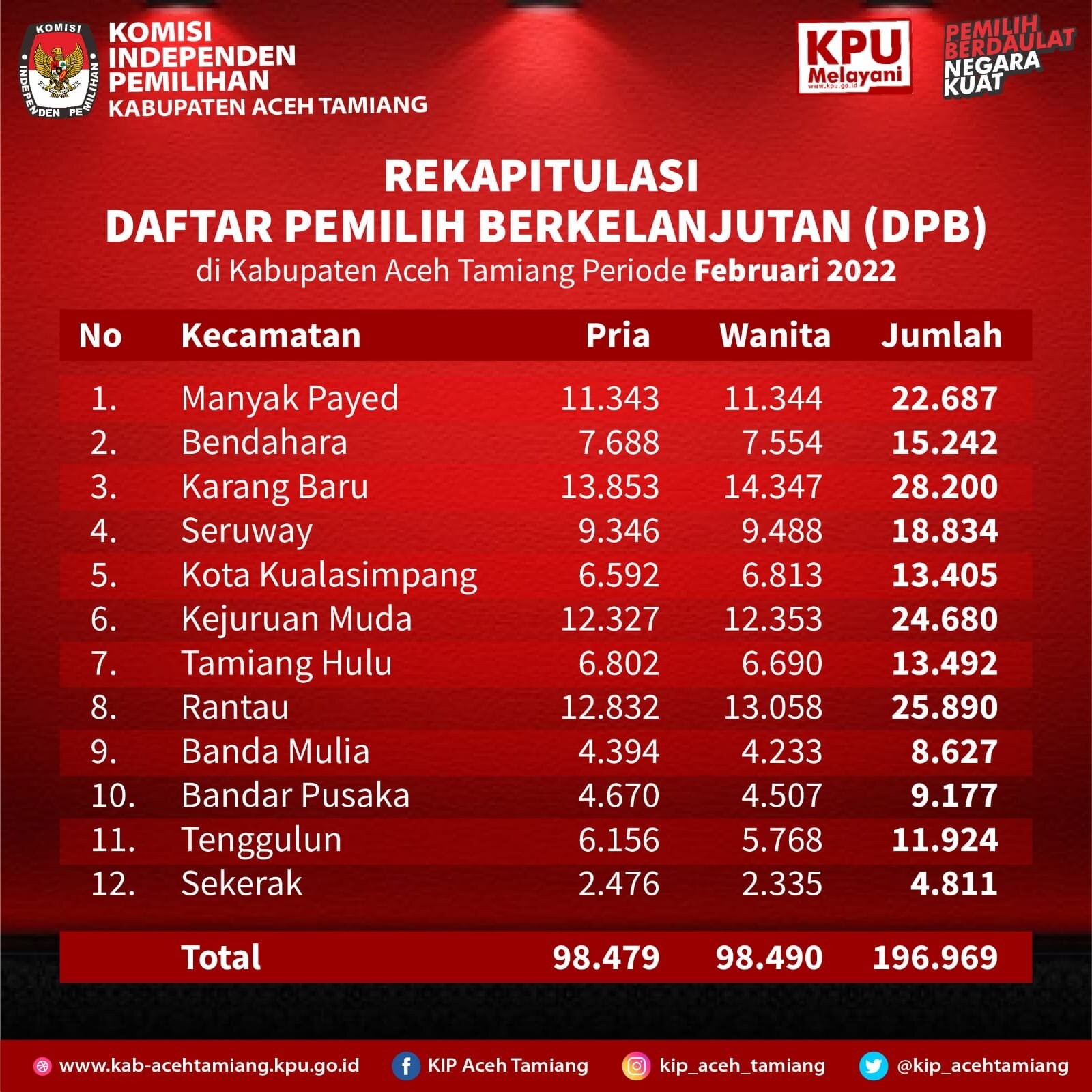 KIP-Aceh Tamiang. Komisi Independen Pemilihan Kabupaten Aceh Tamiang melakukan Rapat Pleno Rekapitulasi Daftar Pemilih Berkelanjutan tahun 2021 pada tanggal 2 Februari 2021 untuk periode bulan Januari dengan jumlah pemilih sebanyak 196.365 (seratus sembilan puluh enam ribu tiga ratus enam puluh lima) pemilih terdiri dari 98.224 (sembilan puluh delapan ribu dud ratus dua pukuh empat) pemilih laki-laki dan 98.141 (sembilan puluh delapan ribu seratus empat puluh satu) pemilih perempuan yang tersebar di 12 Kecamatan dalam Kabupaten Aceh Tamiang.