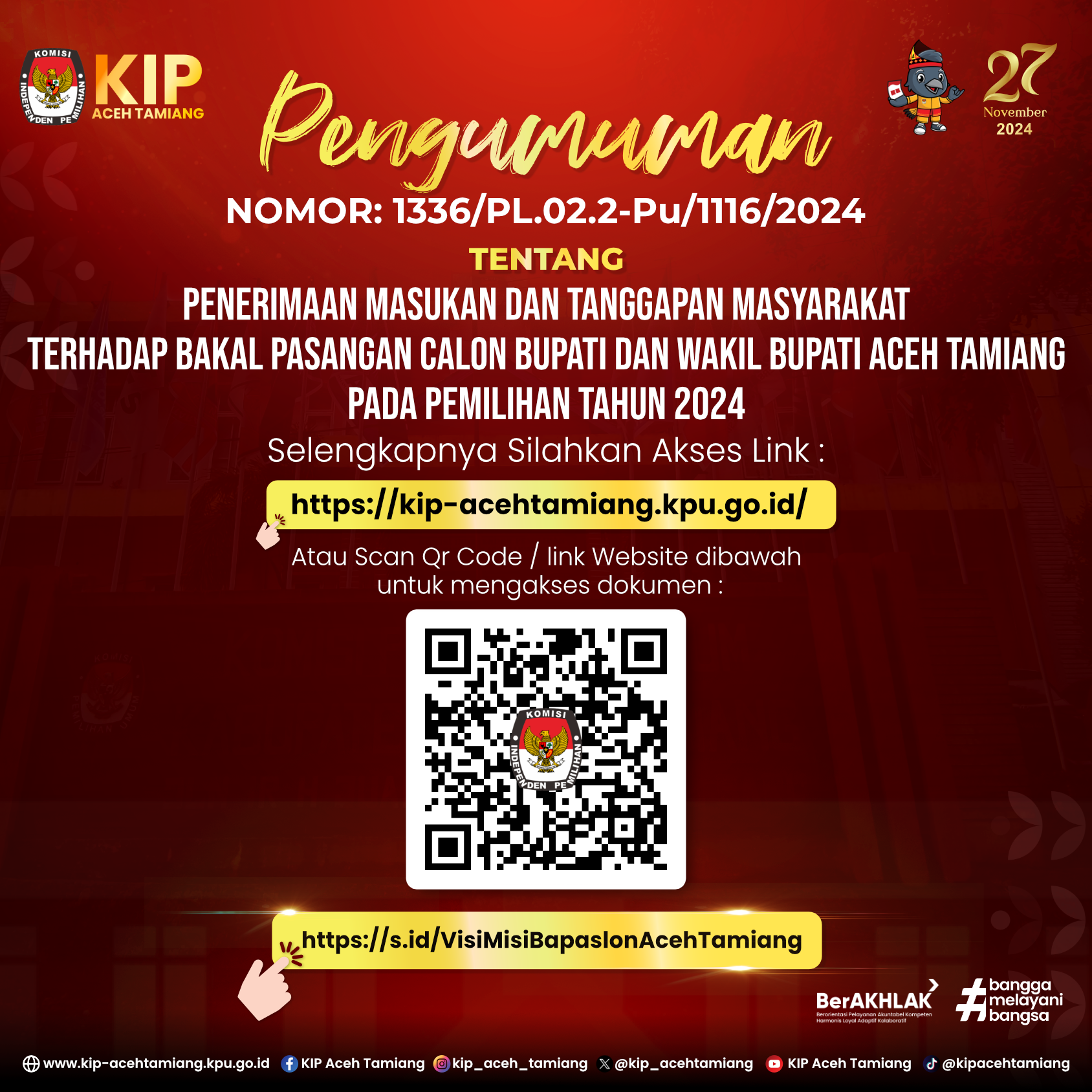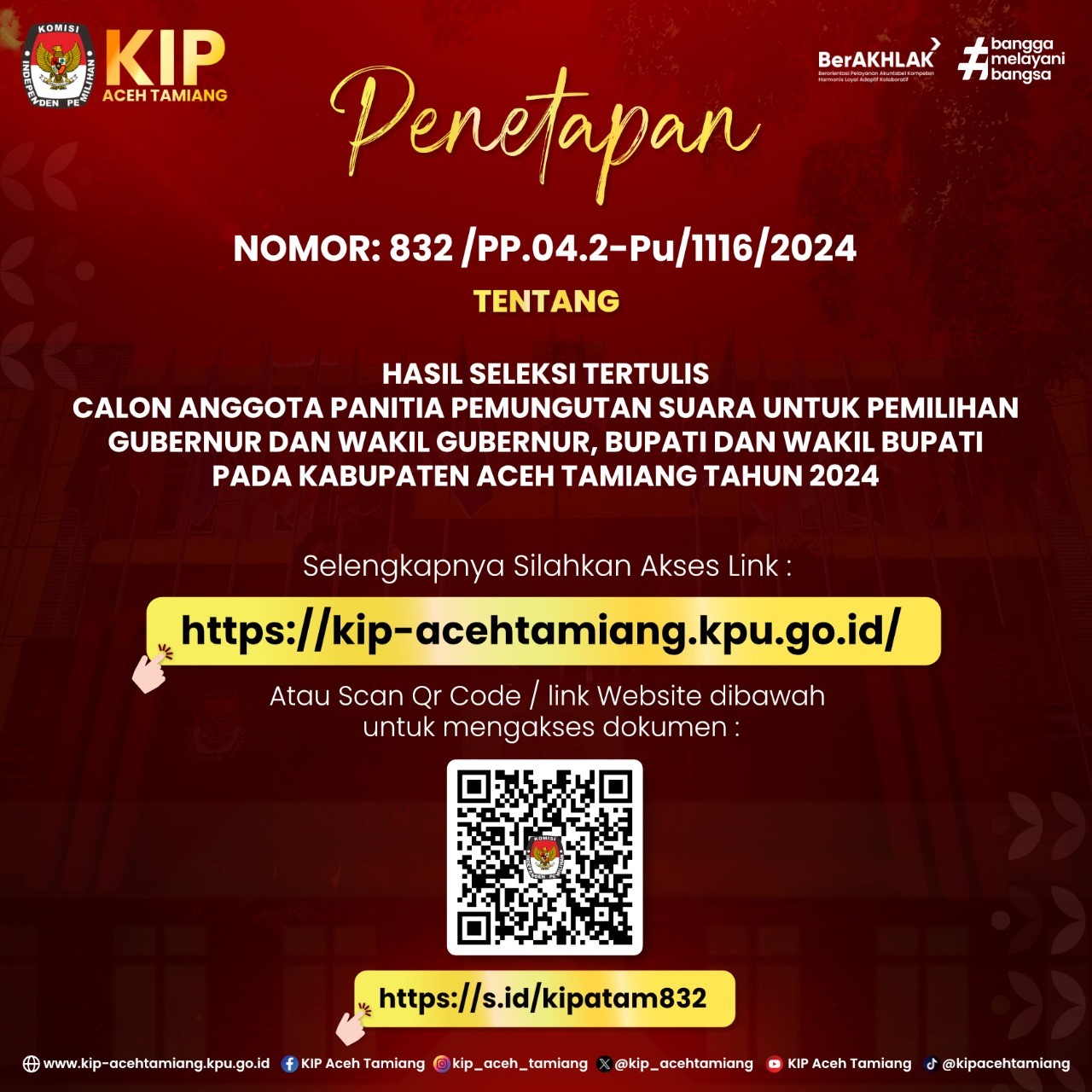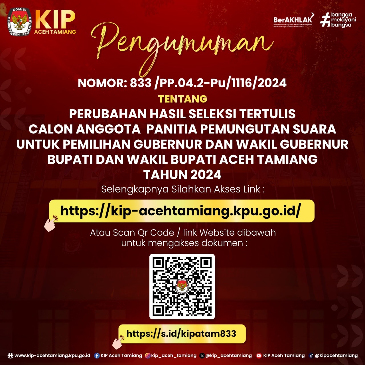 Berikut kami sampaikan Perubahan Pengumuman Hasil Seleksi Tertulis PPS pada Pemilihan Gubernur dan Wakil Gubenur serta Bupati dan Wakil Bupati Tahun 2024, untuk melihat pengumuman silahkan klik dibawah ini :