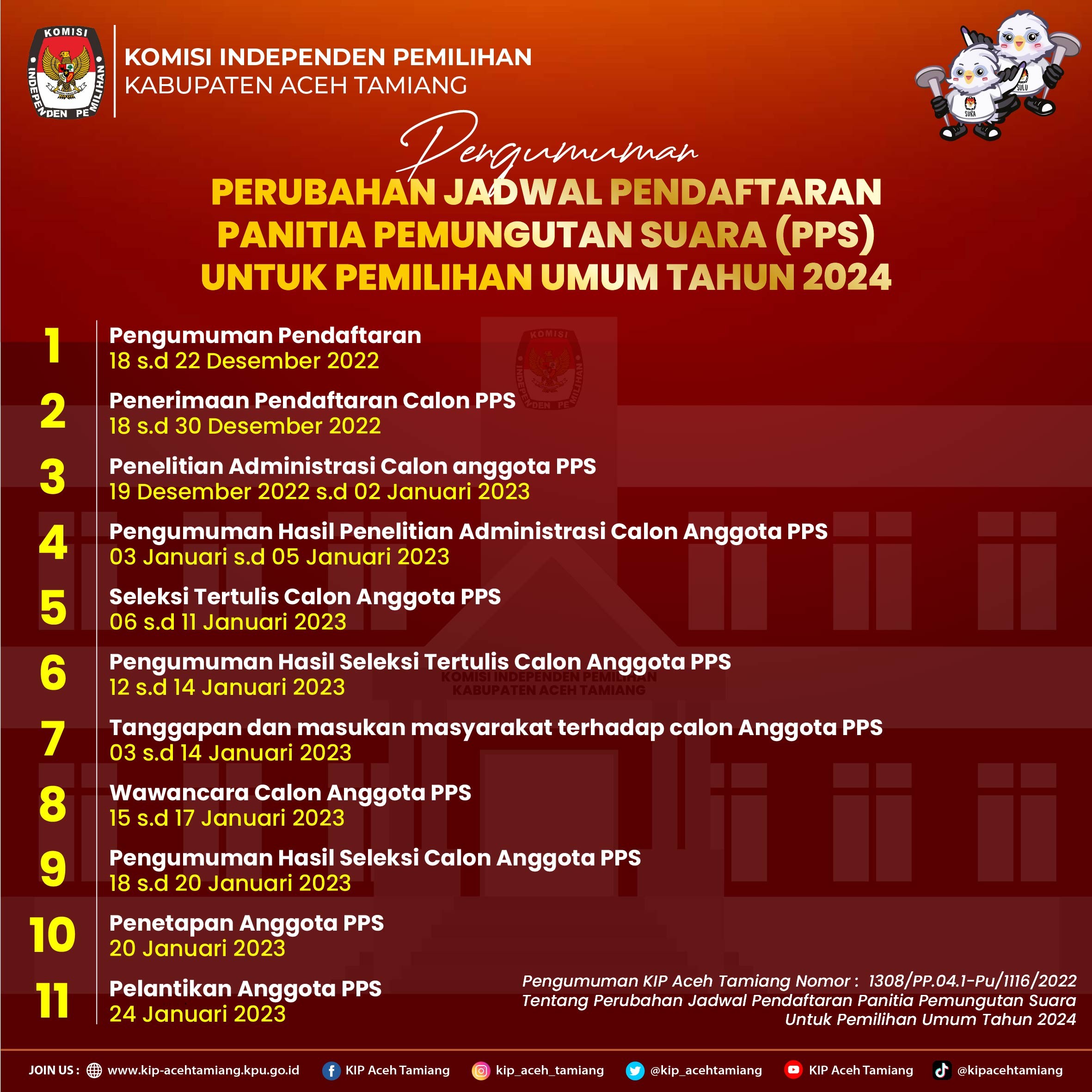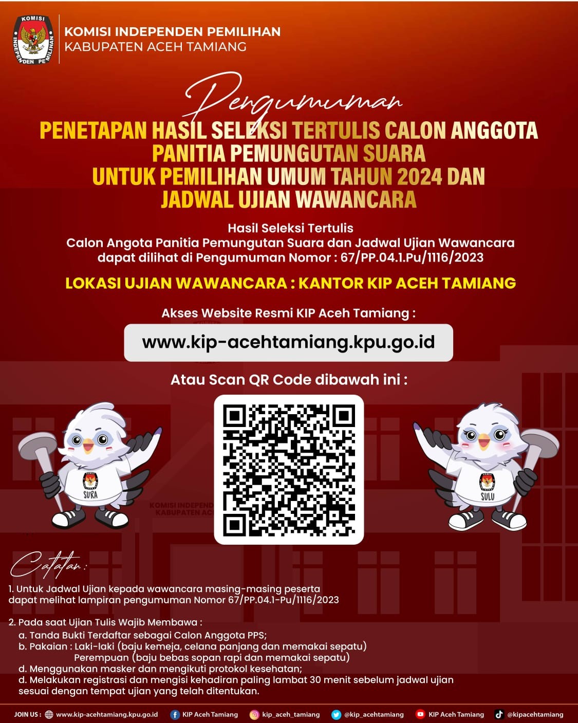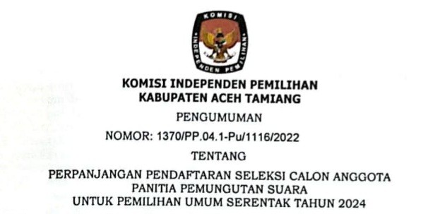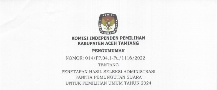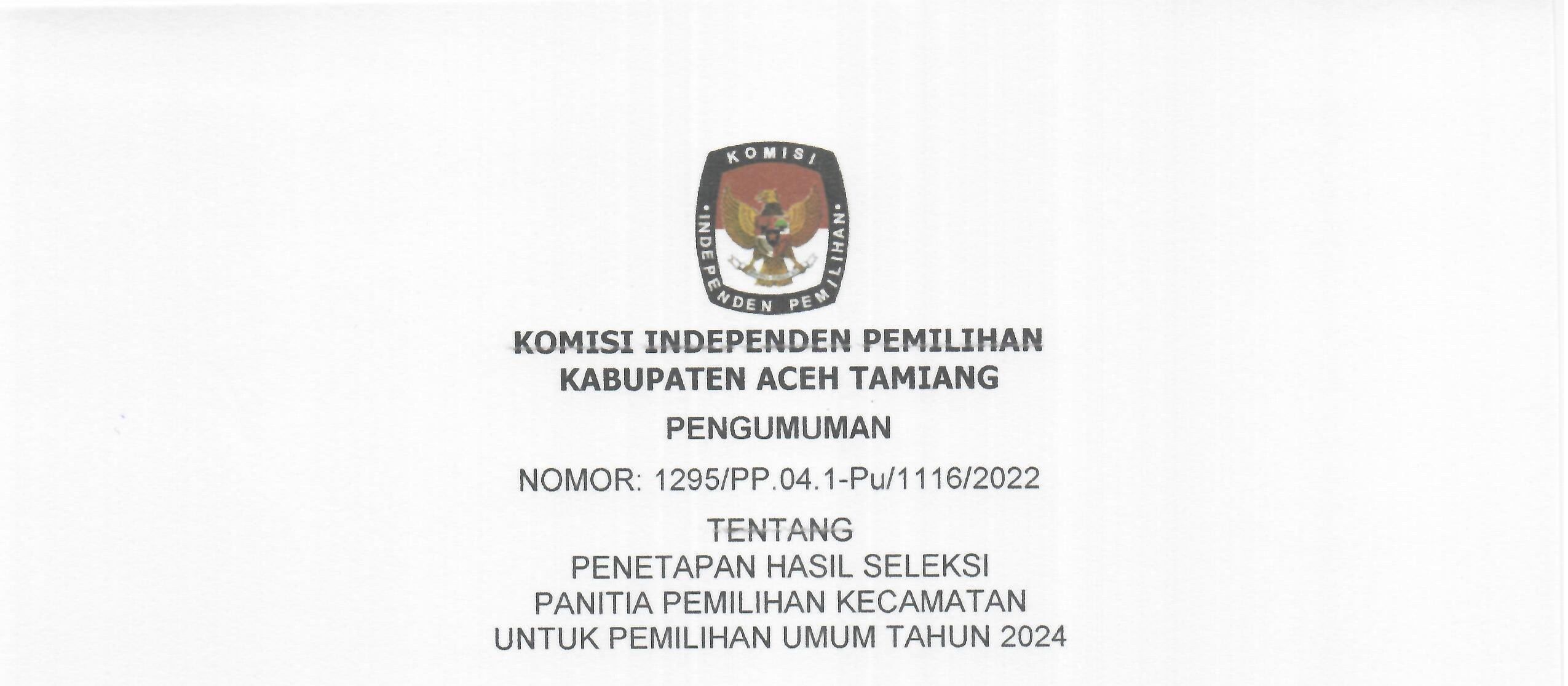 Karang Baru, 15 Desember 2022 Komisi Independen Pemilihan Kabupaten Aceh Tamiang menetapkan Hasil Seleksi Panitia Pemilihan Kecamatan Untuk Pemilihan Umum Tahun 2024, berikut Pengumuman Nomor 1295/PP.04.1.Pu/1116/2022 Tentang Penetapan Hasil Seleksi Panitia Pemilihan Kecamatan untuk Pemilihan Umum Tahun 2024, untuk melihat pengumuman KLIKDISINI
